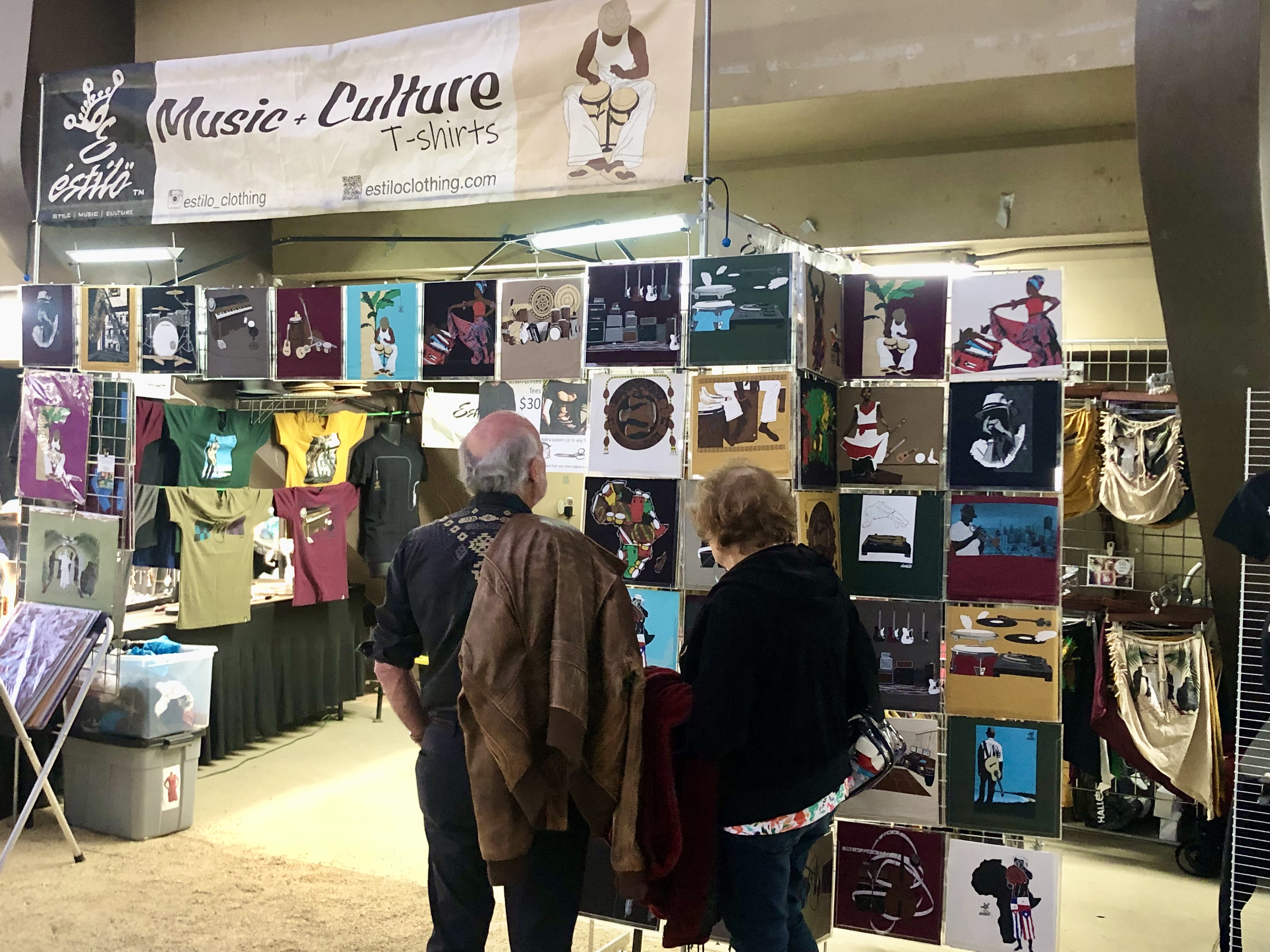 Original designs hand screen-printed by the artist onto clothing and prints to be hung.
